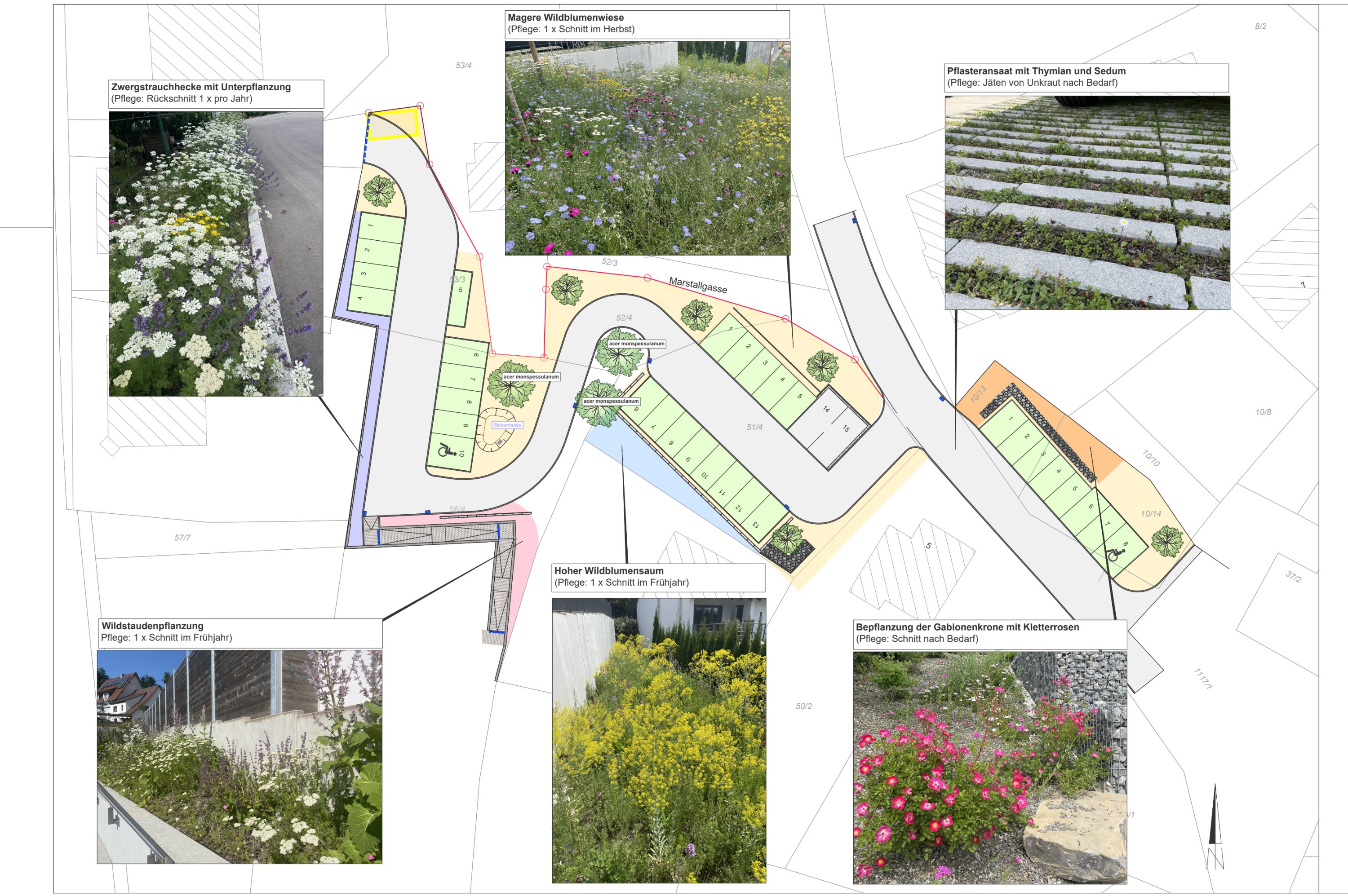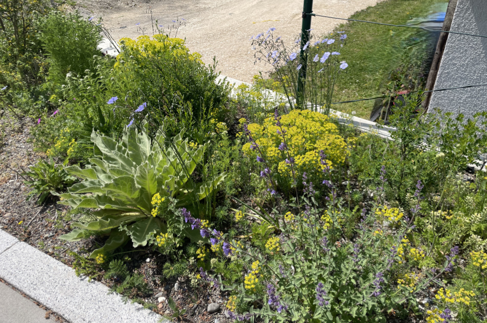 Der Zugangsbereich wird durch hohe Gräser und Stauden gefasst, entlang der Betonmauer sorgt eine mehrjährige Wildblumenhecke für Struktur und zur westlichen Nachbarschaft dient eine blühende Zwergstrauchhecke als Puffer. Im oberen Bereich stabilisieren begrünte Gabionen den Hang, während trockenheitsresistente Kräuter die Pflasterfugen und ein artenreicher Magerrasen die Parkplätze umrahmen.